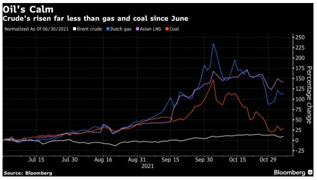 数据显示,自6月底以来,亚洲和欧洲的天然气期货价格上涨了一倍多,煤炭期货价格上涨了25%。相比之下,布伦特原油上涨了10%。