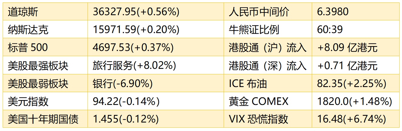 1、 隔夜美股截至上周末收盘,道指涨203.72点,或0.56%,报36327.95点;纳指涨31.28点,或0.20%,报15971.59点;标普500指数涨17.47点,或0.37%,报4697.53点。标普500指数录得连续第7个交易日上涨,纳指连续第10个交易日上涨。上周道指上涨1.42%,纳指上涨3.05%,标普500指数上涨2%。港股ADR指数下跌,按比例计算,收报24689点,跌181.38点或0.73%。