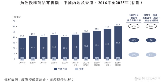 据弗若斯特沙利文资料,2016-2020年,中国内地及中国香港整体角色授权商品的零售额规模由393亿港元增加至404亿港元,复合年增长率约为0.7%;而对于行业未来增长前景展望,弗若斯特沙利文给出的数字则是2021年至2025年角色知识产权授权商品的零售额将以7.6%的复合年增长率快速增长。其给出这一判断则基于,国内知识产权的创作能力不断提升,且消费者对知识产权保护的意识增强。