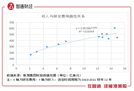 如果仔细研究,不难发现联想集团是科技驱动型公司,其研发费用和收入存在某种微妙关系。智通财经APP透过2010-2021财年,整理该公司研发费用和收入发现,两个指标的线性拟合度(R方)达到85%,而幂指数模型拟合度竟然超过93%,也就是说收入研发费用模型仅有不足7%概率误差。