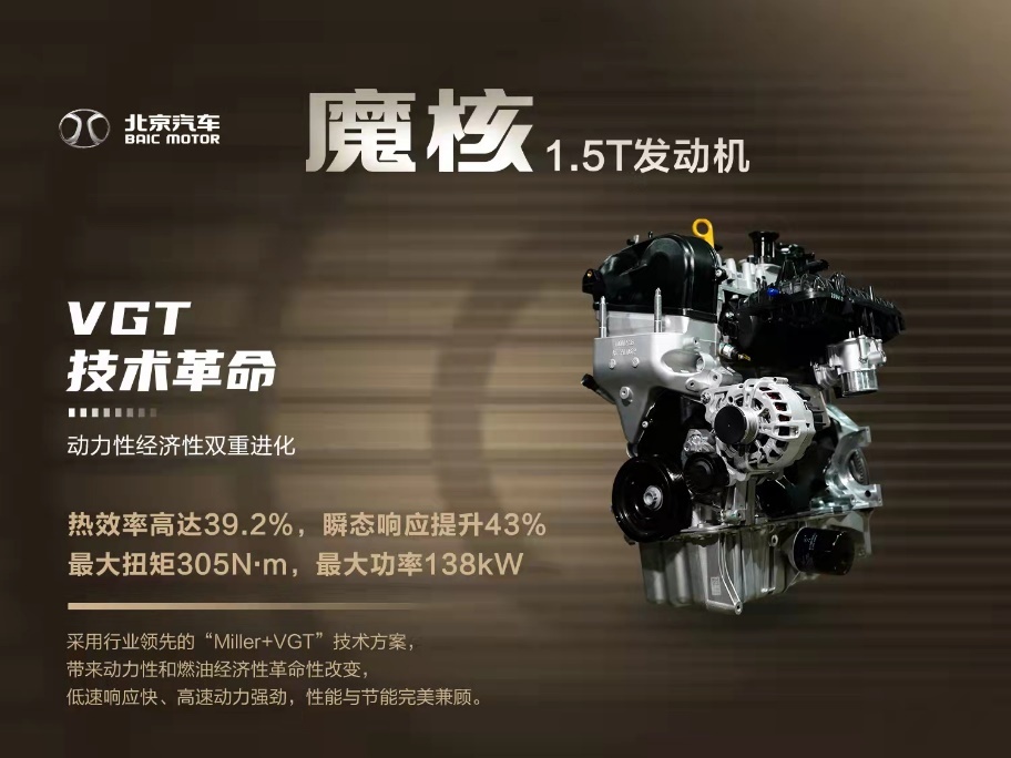 来自于北京汽车魔核动力平台的1.5T发动机,行业首款量产搭载VGT增压器技术,不仅拥有138 kW最大功率、305 N.m最大扭矩,以及高达39.2%的超高热效率的巨大优势;更是同级别产品NVH性能“天花板”,其怠速噪声仅为57.5dB。强大的性能优势,让魔核动力1.5T发动机脱颖而出。