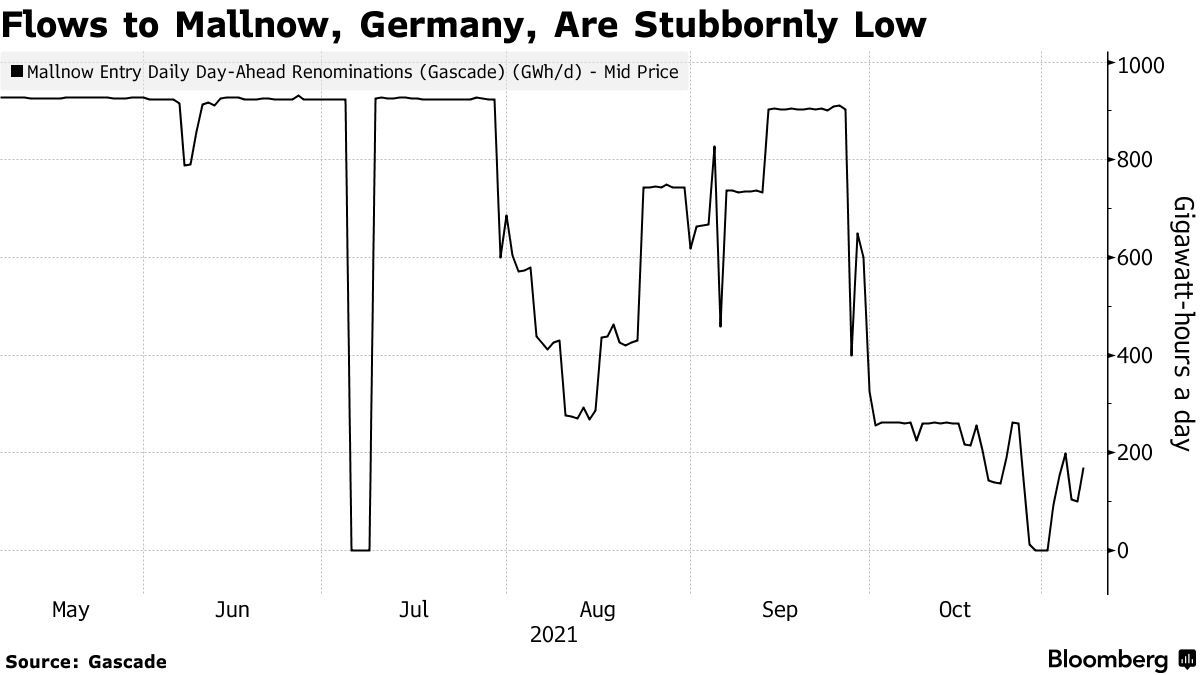 然而,俄罗斯通往德国的一条关键管道的天然气订单显示,周一的出货量仅小幅增加,而上周日的拍卖中同样没有向欧洲输送额外天然气的订单。随着欧洲冬季供暖开始,当地的天然气库存已经跌到10多年来的最低水平,同时天然气价格今年已上涨逾两倍。