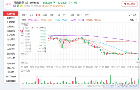 受以上消息直接影响,11月8日港股开盘,再鼎医药股价以大跌11.62%,每股股价700港元的开局低开低走,盘中股价一度跌至最低每股650.5港元,最大跌幅达到17.87%。