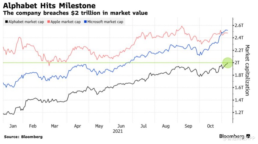 智通财经APP获悉,周一,谷歌母公司Alphabet(GOOGL.US)盘中涨超1%,触及日高3012.295美元,市值达到2万亿美元。这是继苹果(AAPL.US)和微软(MSFT.US)之后,第三家跨入2万亿美元市值的公司。