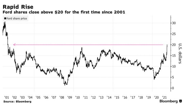 智通财经APP获悉,在受到向电动汽车转型、巧妙应对半导体供应短缺以及两党基础设施法案通过的提振,美东时间11月8日,福特汽车(F.US)股价20年来首次收于20美元关口上方。
