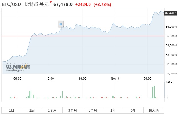 于此同时,比特币价格重新站上67000美元,截止至发稿,比特币涨3.73%,报67478美元/枚。