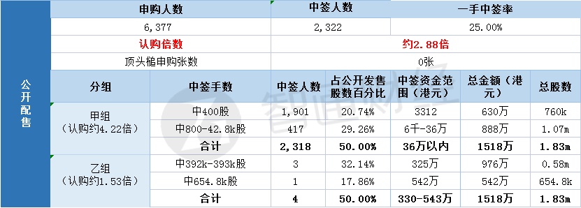 其中,公开配售申购人数6377人,一手中签率25%,认购倍数约2.88倍。