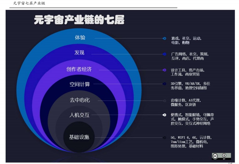 据相关研报披露,元宇宙需要具备六大特性,即持续性、实时性、兼容性、经济属性、可连接性、可创造性。这六大特性缺一不可,只有符合这六大特性的才能被称为元宇宙。产业链则分为七个层次:体验层、发现层、创作者经济层、去中心化层、人机交互层、基础设施层。