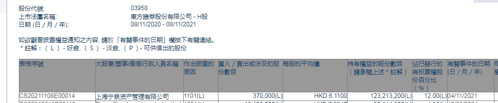 智通财经APP获悉,香港联交所最新资料显示,11月4日,上海宁泉资产管理有限公司增持东方证券(03958)37万股,每股作价6.11港元,总金额为226.07万港元。增持后最新持股数目约为1.23亿股,最新持股比例为12%。