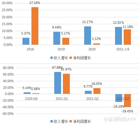 于2016-2019年,该公司股价走了四年长牛,翻了6倍,但其业绩却在2018年发生了变化,收入增长下滑至单位数,净利率也在下降。2020年公司收入增长虽重新站上双位数,而净利率依旧在下降,2021年疫情后行业复苏,上半年表现还不错,但Q3业绩变脸,市场对其利好“信息”开始钝化。