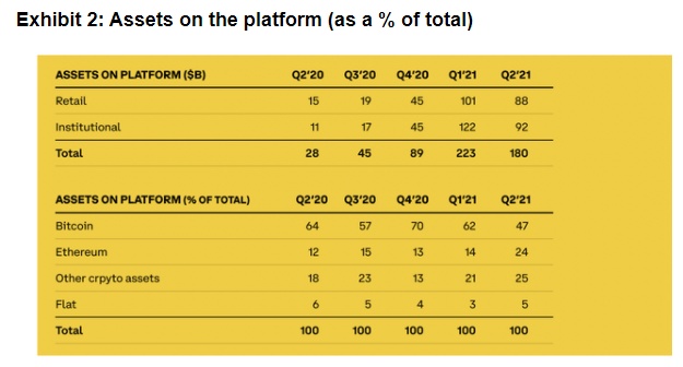 其次,Coinbase非常成功地吸引了广泛的月度活跃用户,这些用户不仅交易主要加密货币,也交易非主要加密资产,这有助于帮助该公司实现收入来源多元化。 二季度交易收入中,比特币和以太坊业务占52%,其他加密资产占交易收入的48%。 这种收入分配表明,尽管投资者认为比特币价格对Coinbase股票价格和公司财富具有巨大影响和控制作用,但比特币业务仅占公司收入的24%左右。这对长期投资者来说是一个非常好的信号。 如下所示,其他替代加密货币开始在Coinbase持有的总资产中占据相当大的比例。