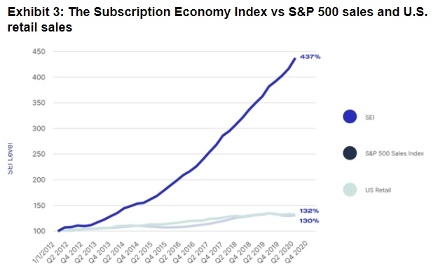 订阅经济正以惊人的速度增长,许多商业部门已经开始接受订阅模式,以寻求与客户建立长期的关系。如下图所示,过去10年,订阅经济(以Zuora发布的订阅经济指数水平衡量)轻而易举地超过了标普500指数公司的收入增长和美国零售销售额。