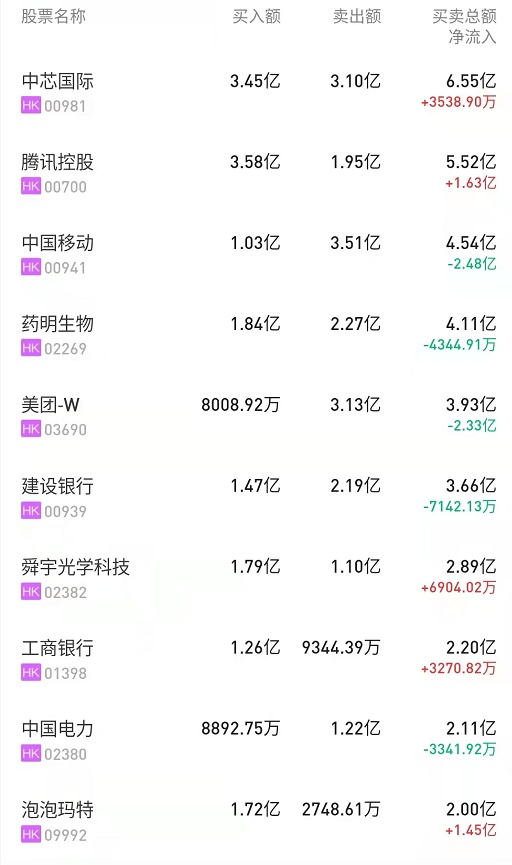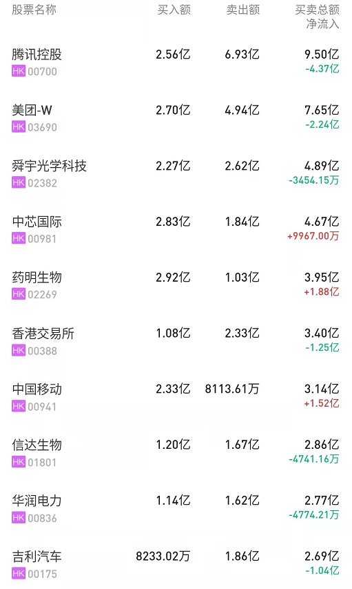此外,舜宇光学(02382)、工商银行(01398)分别获净买入3449万、3270万港元。而腾讯(00700)、中国移动(00941)、建设银行(00939)分别遭净卖出2.74亿、9623万、7142万港元。