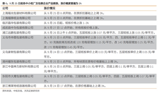 9月中旬起,几大龙头纸厂相继宣布停机、涨价,9月25日起,华东地区60多家纸板厂宣布上涨,并且部分企业将在本月底停止生产。9月28日,多家纸板厂发布新的涨价函,宣布本月纸板价格进行第二轮上涨;10月6日-7日,新一批原纸涨价函逐步发出,涵盖箱板纸、瓦楞纸、纱管纸等纸种,中小纸厂跟涨现象明显。