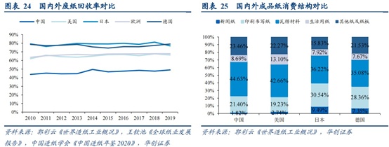 究其根本,废纸价格大幅提升,一方面为早期出台的“限废令”。长期以来,我国废纸回收率便低于日本、德国、美国等国家,在这其中,日本和德国的废纸回收率较高于美国,而美国则较高于我国。可以看到的一个明显差距的是,虽然我国和美国的成品纸消费结构类似,但历年废纸回收率却存有15-20pct之差。而由于提升废纸回收质量有利于缓解我国废纸原料不足的问题,因此“限废令”的出现也相当于间接地推动我国废纸回收率的提升。