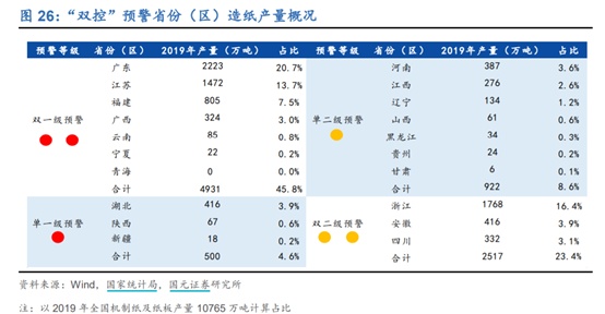 在“限产限电”背景下,个龙头纸业开启检修停机潮,青海、宁夏、广西、广东、福建、新疆、云南、陕西、江苏等9省节能减排形势严峻。尤其是广东省和江苏省,这两个省份是造纸生产大省,能耗双控完成预警等级较高。而广东省造纸产量占比最高为20.7%,江苏产量占比13.7%,两省后续限电措施也会影响造纸业的供应。