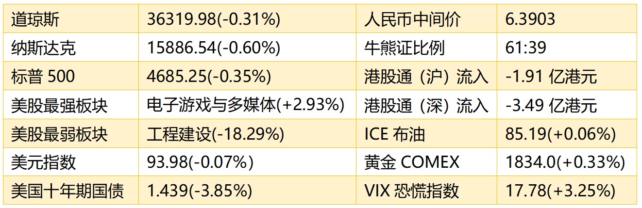 1、 隔夜美股截至收盘,道指跌112.24点或0.31%,报36319.98点;纳指跌95.81点或0.60%,报15886.54点;标普500指数跌16.45点或0.35%,报4685.25点。本周四(11月11日)是美国的退伍军人节,美国证券交易所将继续交易。债券市场、联邦储备银行和美国的许多银行机构将关闭。港股ADR指数下跌,按比例计算,收报24747点,跌66.37点或0.27%。