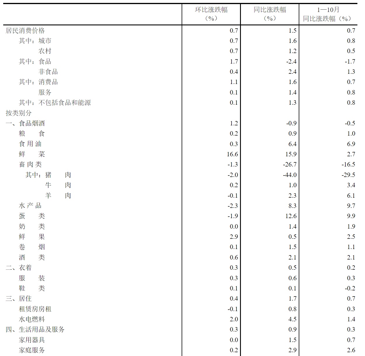 10月份,全国居民消费价格环比上涨0.7%。其中,城市上涨0.7%,农村上涨0.7%;食品价格上涨1.7%,非食品价格上涨0.4%;消费品价格上涨1.1%,服务价格上涨0.1%。