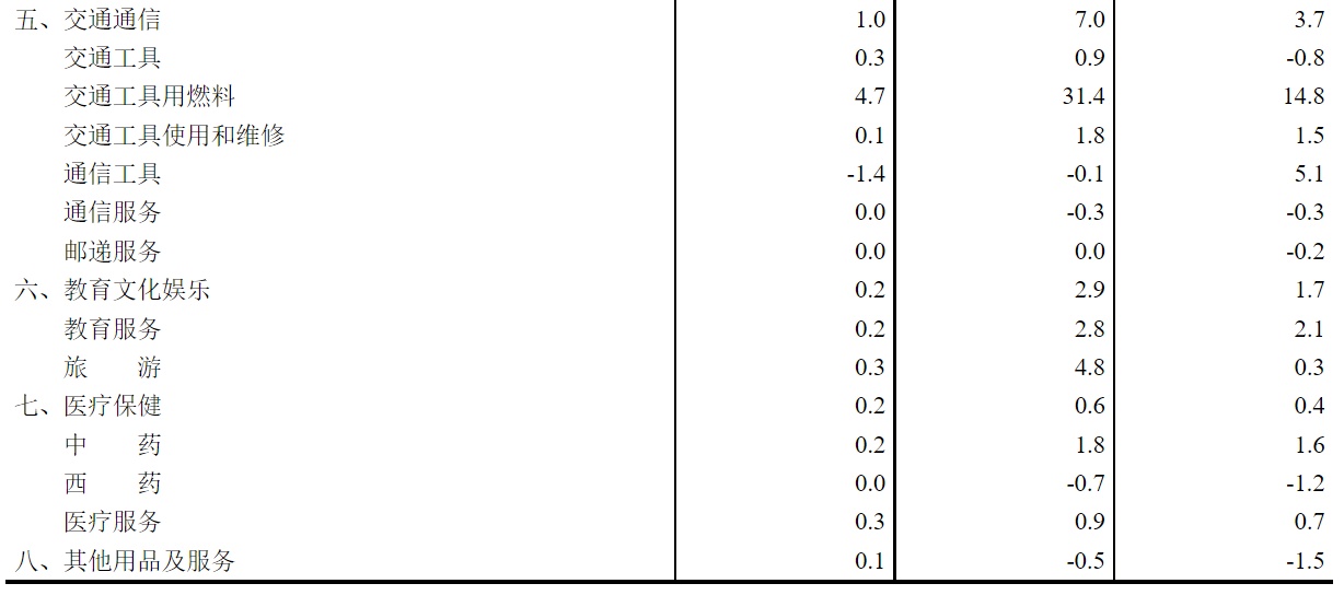 其他七大类价格同比六涨一降。其中,交通通信、教育文化娱乐、居住价格分别上涨7.0%、2.9%和1.7%,生活用品及服务、医疗保健、衣着价格分别上涨0.9%、0.6%和0.5%;其他用品及服务价格下降0.5%。
