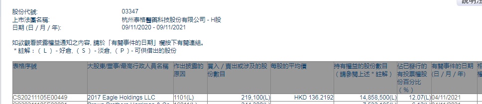 智通财经APP获悉,香港联交所最新资料显示,11月4日,2017 Eagle Holdings LLC增持泰格医药(03347)21.91万股,每股作价136.2192港元,总金额约为2984.56万港元。增持后最新持股数目1485.85万股,最新持股比例为12.07%。