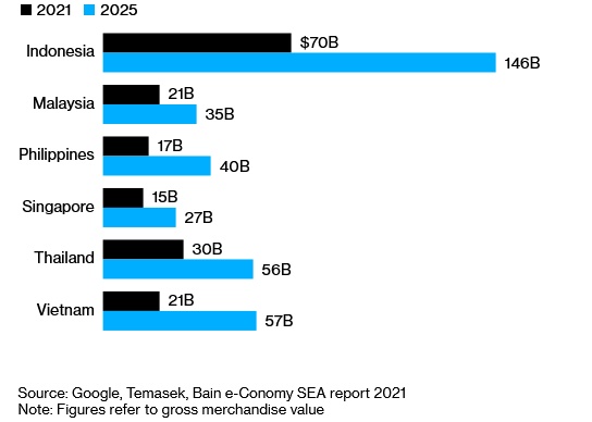 在东南亚地区中,印尼有着最大的数字经济规模:该国2025年的在线消费可能会较今年翻一番,至1460亿美元;今年上半年,该国的风险投资交易规模就已超过了过去四年的总和。而越南预计将有着最快的增速,其在线商品交易总额有望在未来四年增长近两倍。