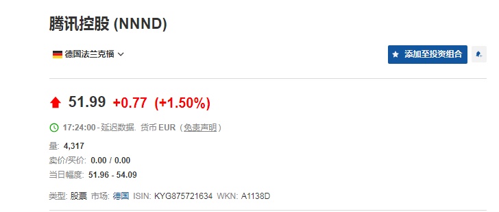 智通财经APP获悉,今日(11月10日)港股盘后,腾讯(00700)公布第三季度业绩数据,其中三季度营收不及预期。受此影响,截至北京时间17:24,德国法兰克福市场上,腾讯控股涨幅收窄至1.50%,报51.99欧元,折合约468港元,较港股收盘价483.60港元跌约3%。