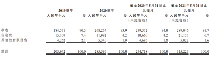 收入的提升,主要来自学费以及住宿费的增多。以2021财年前九个月为例,公司学费收入同比增长20.8%达到2.89亿元,住宿费则有高达98.5%的涨幅,达到2115.5万元。