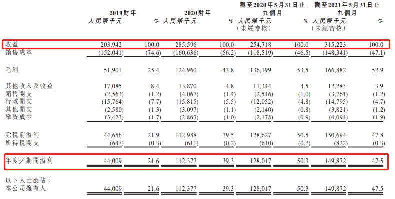 净利润方面,从2019财年的4400.9万元增长155.5%至2020财年的1.12亿元,2021财年前九个月的净利润为1.50亿元,相较去年同期增长17.1%。