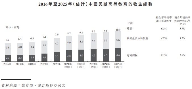 根据弗若斯特沙利文的报告,我国民办高等教育的收生总数从2016年的620万人,增长至2020年的790万人,复合年增长率为6.5%。预计这一数字会继续增加至2025年的1020万人,从2020年算起的复合年增长率为5.1%。其中研究生及本科为3.7%,专科课程达到7%。