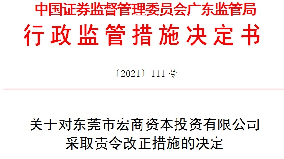 广东证监局提出,东莞市宏商资本投资有限公司应高度重视上述问题,制定切实有效的整改方案,对存在的问题进行整改,并于收到本决定后30日内将整改报告、内部问责情况报告及相关责任人的书面检查报送广东证监局。