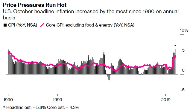 智通财经APP获悉,周三,根据美国劳工部数据显示,美国10月CPI年率未季调为6.2%,预期5.9%,前值5.4%,为1990年以来最高增幅。美国10月核心CPI年率未季调为4.6%,预期4.3%,前值4%。