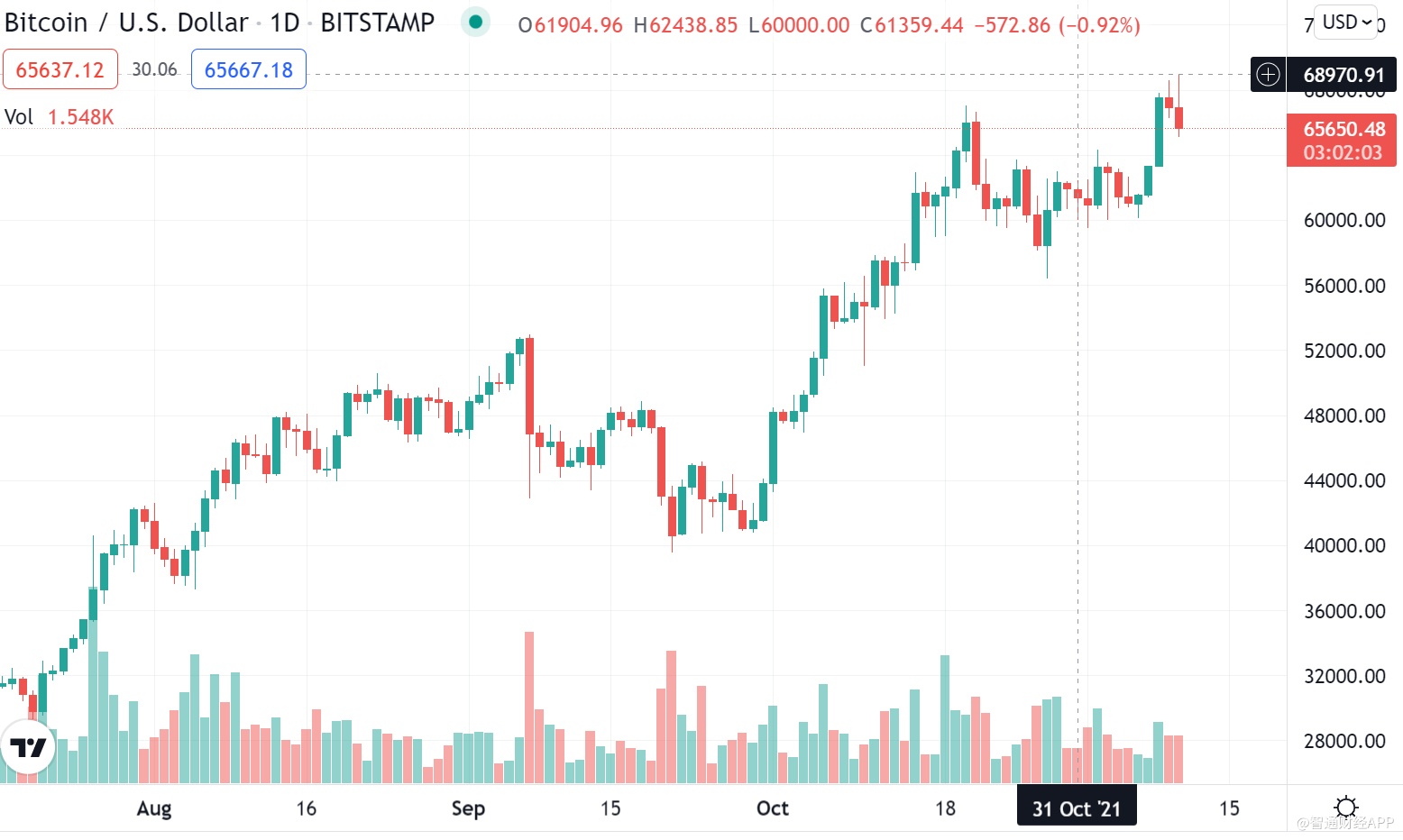 智通财经APP获悉,周三,在美国10月CPI数据公布后,因越来越多投资者相信加密货币是对冲通胀的有效工具。市值最高的比特币价格再创历史新高,首次逼近6.9万美元/枚。