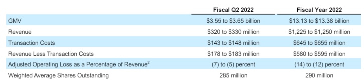 展望未来,该公司预计Q2 GMV在35.5-36.5亿美元之间,营收在3.20-3.30亿美元之间;预计2022财年全年GMV在131.3-133.8亿美元之间,营收在12.25-12.50亿美元之间。