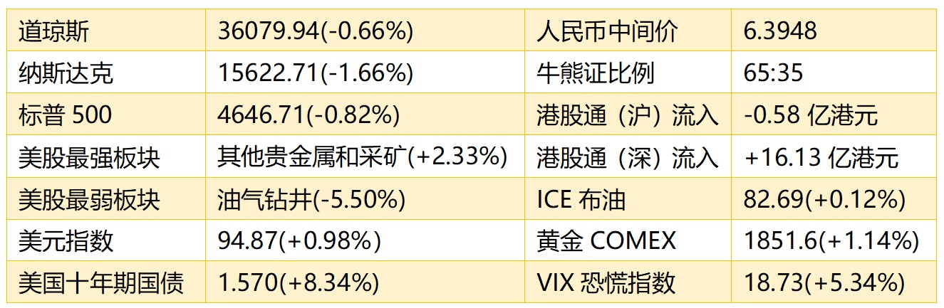 1、 隔夜美股截至收盘,三大股指低开低收,纳指盘中一度跌超2%。截至收盘,道指跌240.04点或0.66%,报36079.94点;纳指跌263.84点或1.66%,报15622.71点;标普500指数跌38.54点或0.82%,报4646.71点。港股ADR指数下跌,按比例计算,收报24880点,跌115.58点或0.46%。