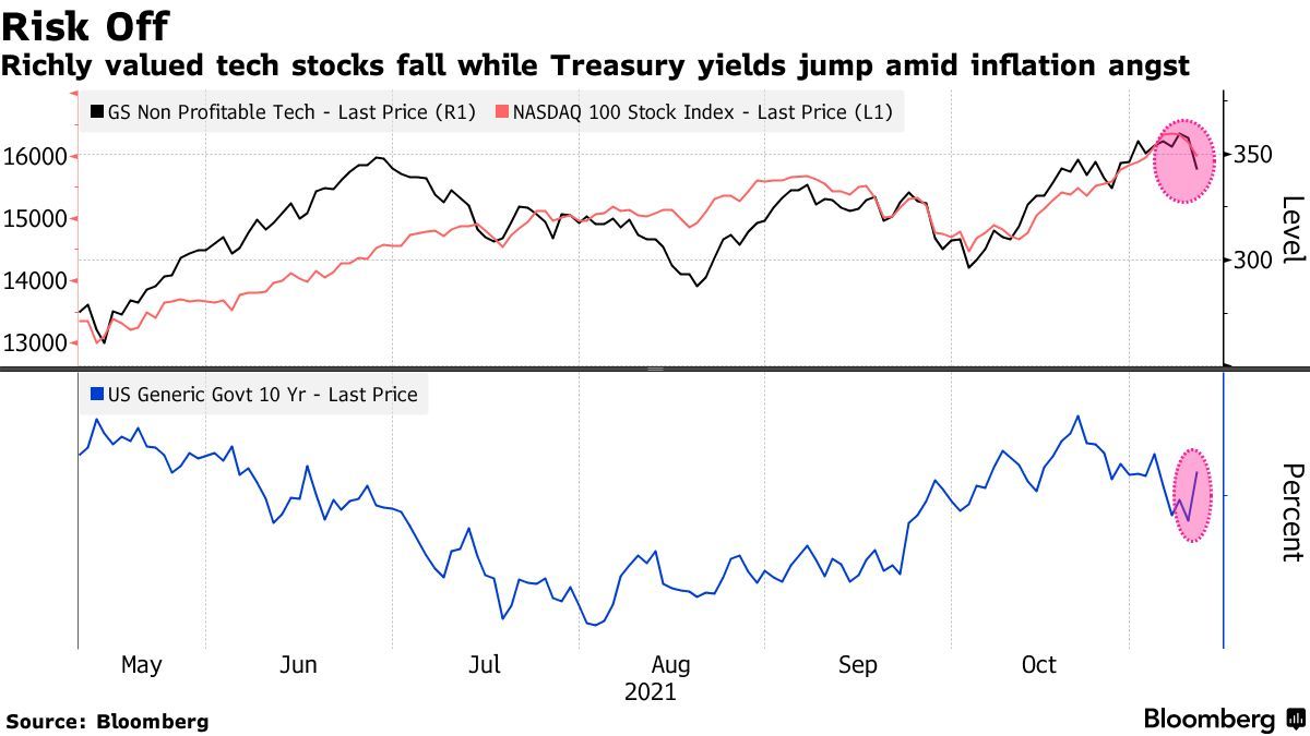 诚然,标普500指数在此前数周持续上涨,截至周一的19个交易日中有17个交易日上涨,为1971年以来的最佳表现。但昨日,美国月度CPI出现自1990年以来的最大增幅后,股票遭到抛售,其中纳斯达克100指数下跌超过1%,创一个月来最大跌幅,估值较高的股票首当其冲。高盛统计的一篮子未盈利的科技股下跌约4%,同样为一个月来最大跌幅。