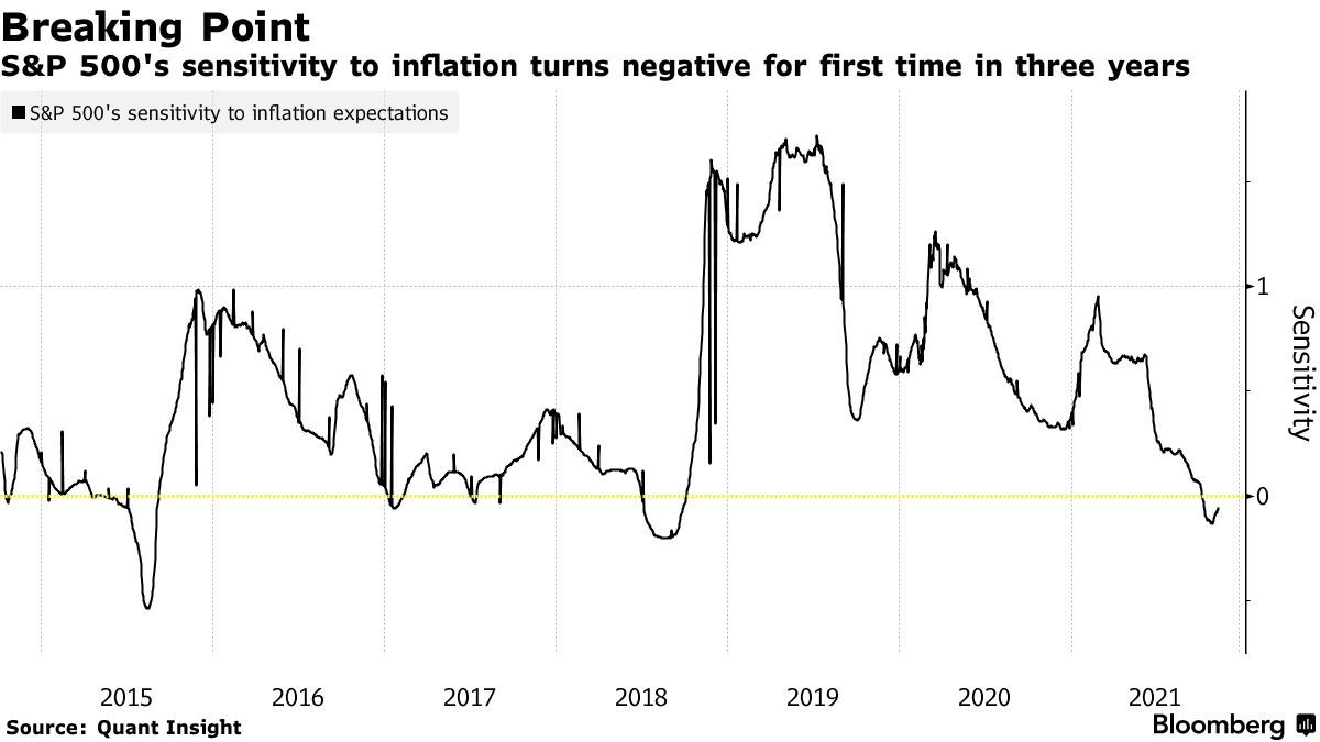 智通财经APP了解到,总部位于伦敦的分析研究公司Quant Insight主要研究资产价格与二十多个宏观因素之间的关系,该公司表示,上个月标普500指数对通胀预期上升表现出负敏感性,这是三年来首次。