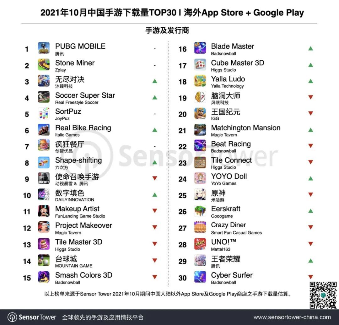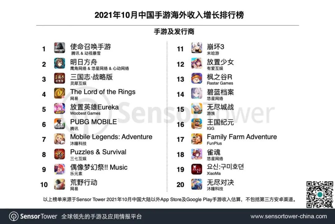 Mobile》10月海外收入环比增长8.8%至9600万美元,重回出海手游收入榜首。截至10月底,该游戏海外累计收入已突破30亿美元,是目前中国手游海外收入最高纪录的保持者。同时,《PUBG