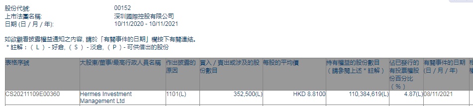 智通财经APP获悉,香港联交所最新资料显示,11月8日,Hermes Investment Management Ltd增持深圳国际(00152)35.25万股,每股作价8.81港元,总金额约为310.55万港元。增持后最新持股数目约为1.10亿股,最新持股比例为4.87%。