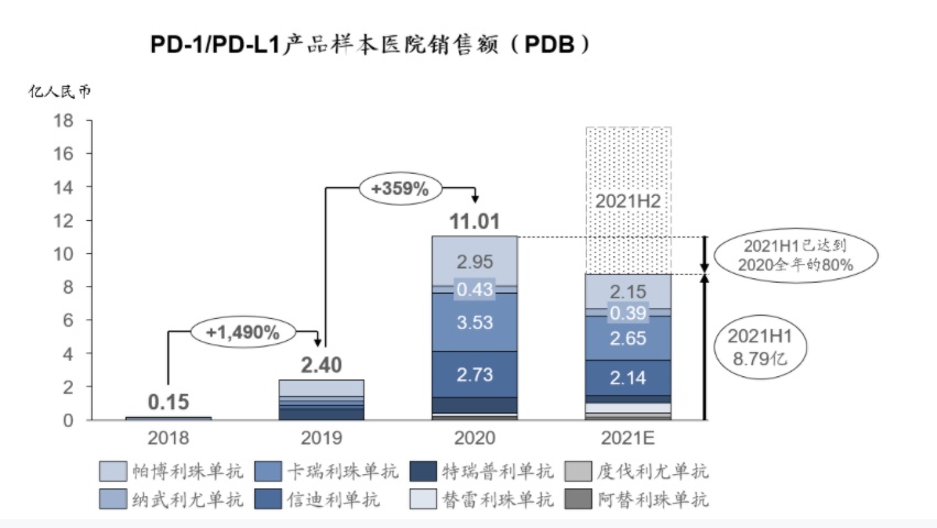 2021年上半年,根据PDB数据,PD-1/PD-L1产品在样本医院的销售额已经达到2020年的80%,预计2021年PD-1的总销售额会继续上升。