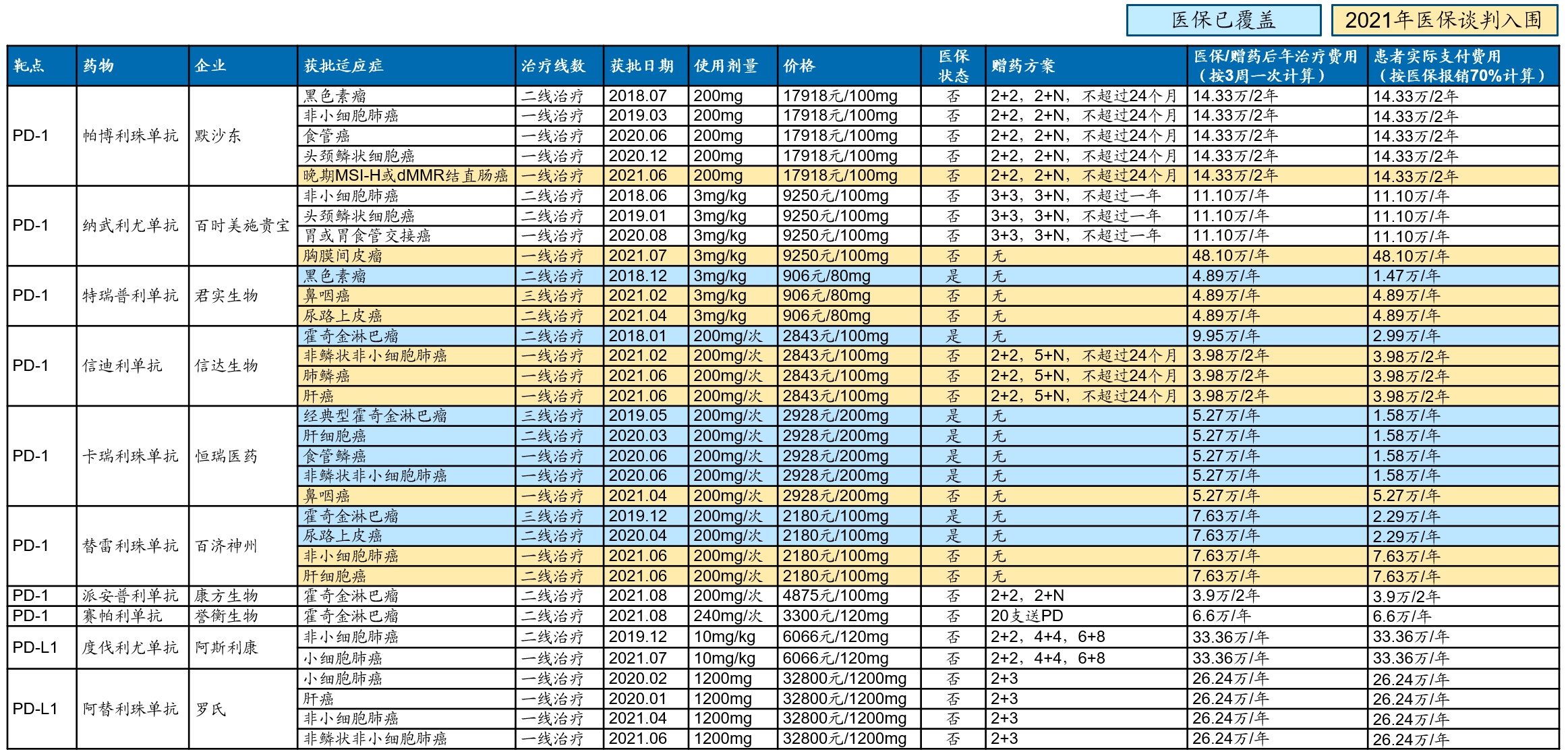 2021年医保谈判,四大国产PD-1均入围了新适应症,此外帕博利珠单抗和纳武利尤单抗也分别有一个小适应症入围医保谈判。2021年8月获批的派安普利单抗和赛帕利单抗由于获批时间原因,不能参加2021年医保谈判,目前也采用了慈善赠药的方式降低患者实际支付的费用。