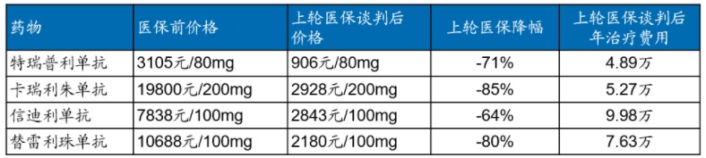 3. 国产四大PD-1上轮医保谈判降价60-80%,我们预计2021年医保谈判降价幅度为10-20%,医保政策趋势边际回暖。