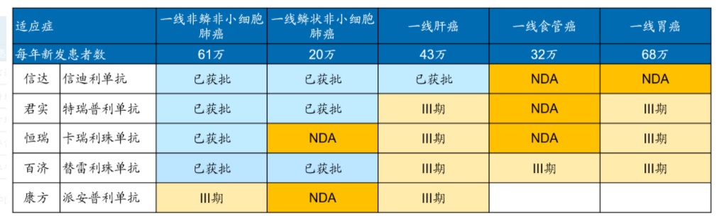 4. 国产PD-1争相布局患者人数较多的大适应症,预计1-2年内会覆盖5大瘤种的一线适应症。