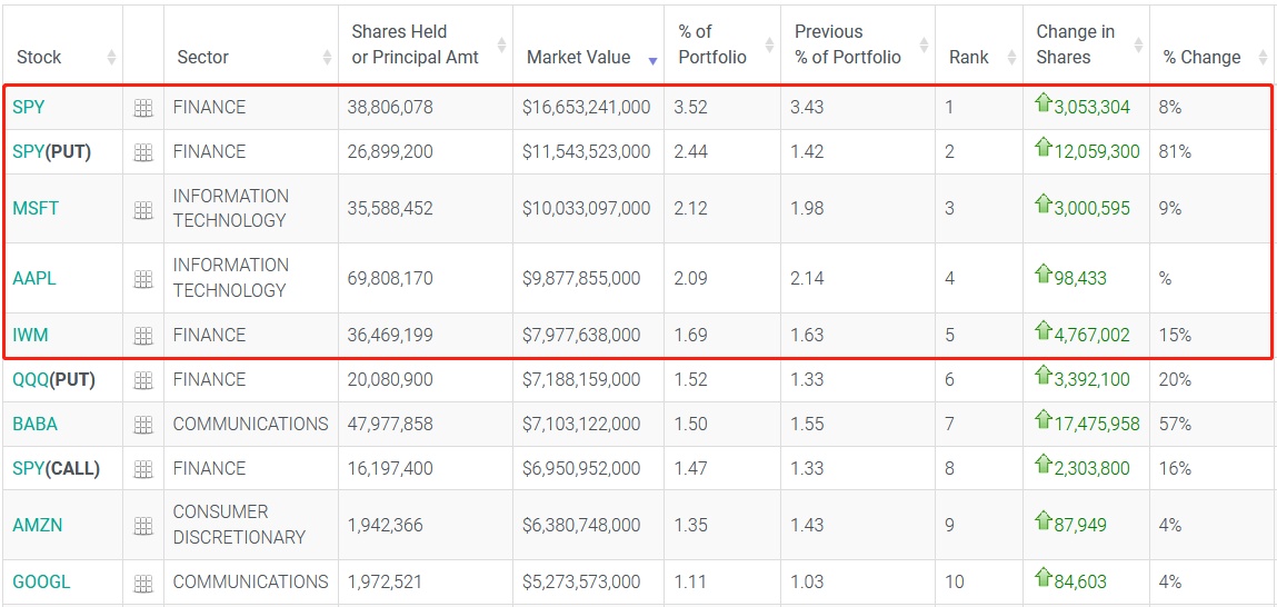 标普500指数ETF看跌期权(SPY.US.PUT)位列第二,持仓2689.92万股,持仓市值约115.44亿美元,较上季度持仓数量增加了81%,占投资组合比例为2.44%。