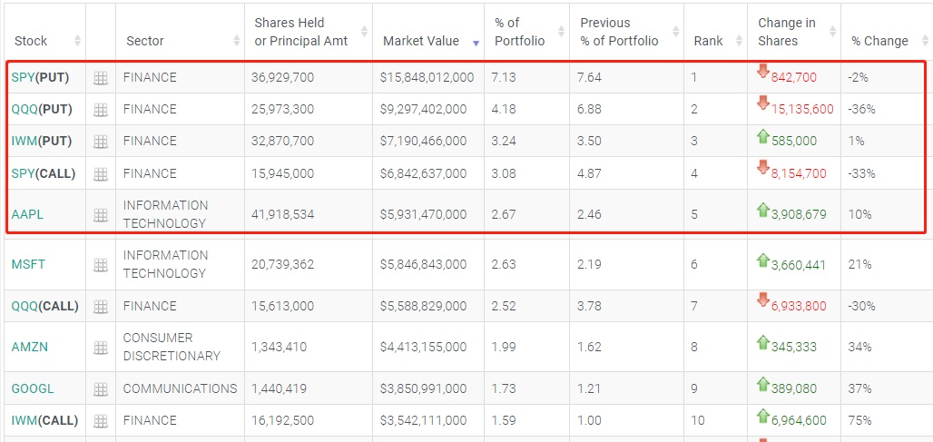 罗素2000指数ETF(看跌期权,IWM)位列第三,持仓约3287万股,持仓市值约72亿美元,较上季度持仓数量增加了1%,占投资组合比例为3.24%。