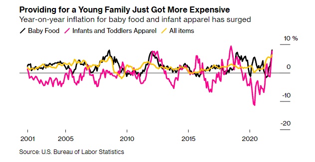Inflation Insights LLC的Omair Sharif表示:“让孩子吃饱穿暖越来越贵了。婴儿食品价格同比上涨了7.9%,这是2008年年中以来的最快增速,而且似乎很快就会创下有史以来最大的年增长率。”