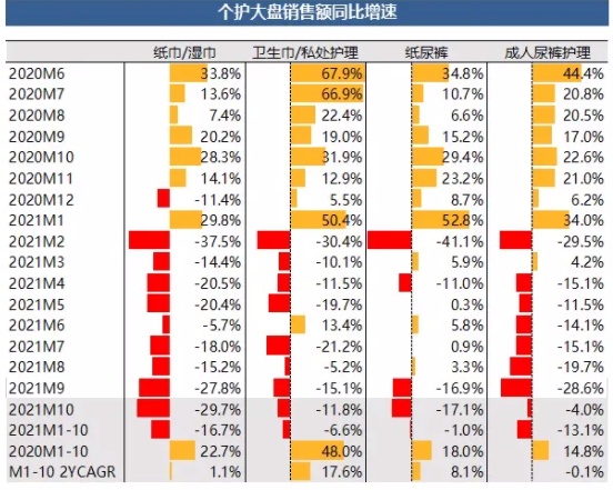卫生巾方面,竞争格局优化,头部品牌集中度持续提升。分品牌看,护舒宝、高洁丝、乐而雅增速继续加快,2021M10销售额同比增长20%/30%/26%。