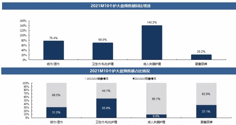 成人尿裤护理方面,2021M10预售额增长140.2%,当月大盘表现偏弱,仅有添宁实现正增长,但头部品牌销售额占比呈提升态势。