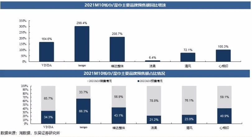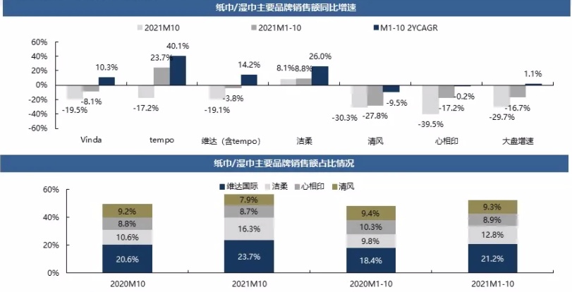 纸巾方面,2021M10纸巾/湿巾品类预售额同比增长76.4%,销售额同比下降29.7%,2021M1-M10累计同比下滑16.7%,2021M1-M10同2019M1-M10同期相比两年复合增速为1.1%。细分品类来看,高端品类增速提升。分品牌来看,2021M10洁柔增长稳健,销售额占比同比提升。