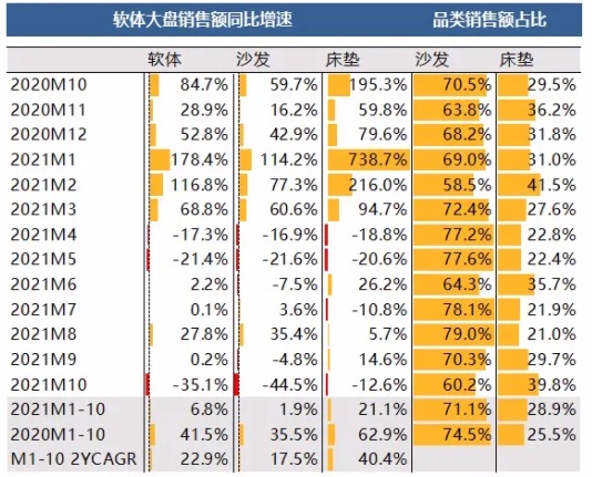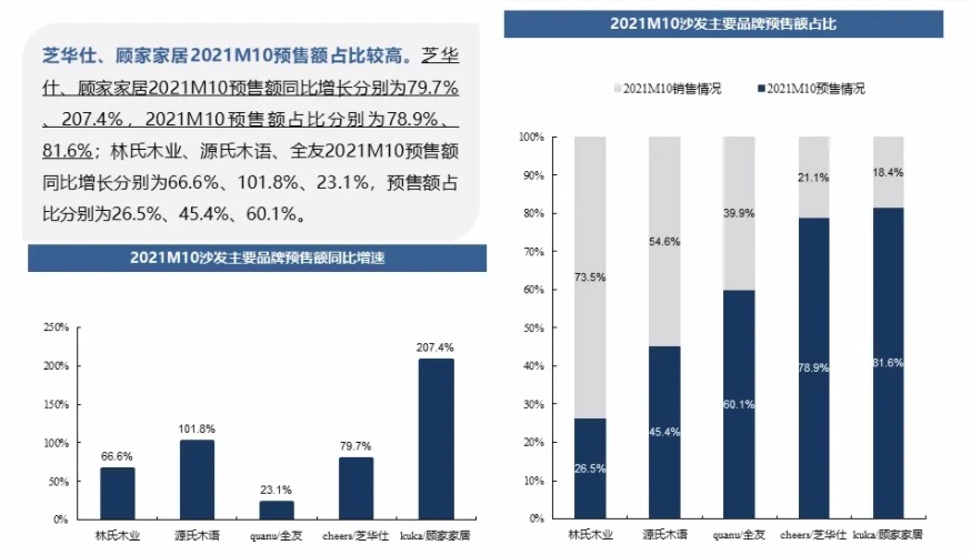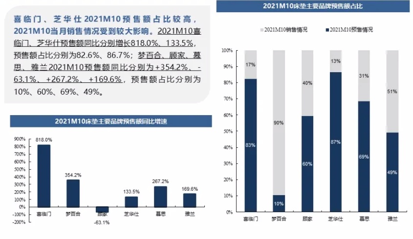 沙发方面,2021M10销售额同比-44.5%,预售额同比+91.4%,2021M1-M10同比+1.9%。分品牌来看,全友增速靓丽,2021M10销售额同比+52.8%。