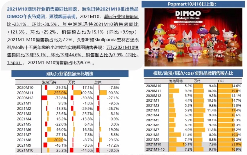 潮玩方面,2021M10潮玩销售额同比回落,2021M10销售额同比-23.1%,环比-38.5%,泡泡玛特2021M10头部IP如Skullpanda密林古堡等表现靓丽,销售额同比+121.3%,环比+25.2%,销售额占比为15.1%,同比+9.9pp,2021M1-M10销售额占比为7.2%;万代2021M10销售额、销售额占比均有所下降,销售额同比下降35.1%,环比下降44.6%,销售额占比为7.9%,同比-1.5pp,2021M1-M10销售额占比为9.7% 。